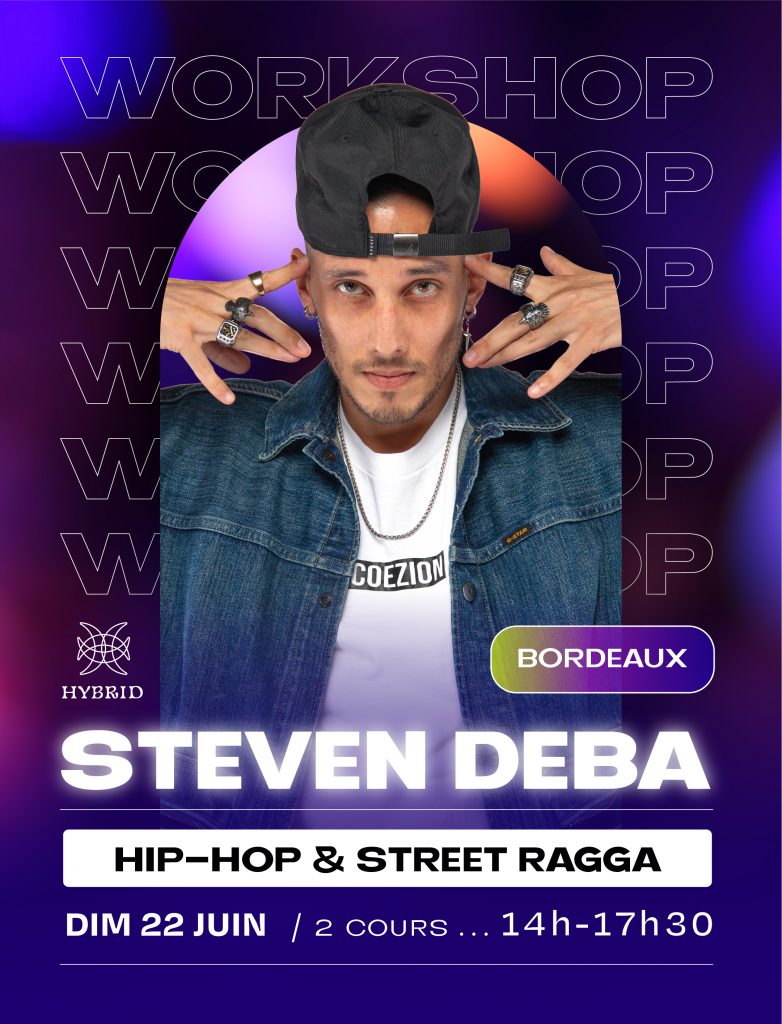 On est heureux d'accueillir Steven Deba pour un workshop intensif en Hip-Hop & Street Ragga ! 3h30 de danse pour vous challenger aux côtés d’un danseur de haut niveau (ALLin Dance Crew, TRYPTIK), co-gérant de COEZION. Il enseigne depuis 12 ans et partage sa vision musicale avec passion en France et à l’international.